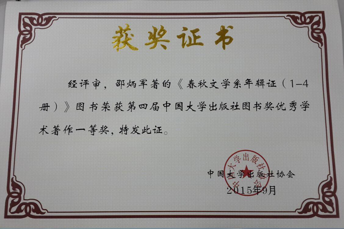 邵炳军教授所著《春秋文学系年辑证》为2010年中国大学出版社图书奖设立以来,为我校教师所获该奖项中学术著作类的最高奖。