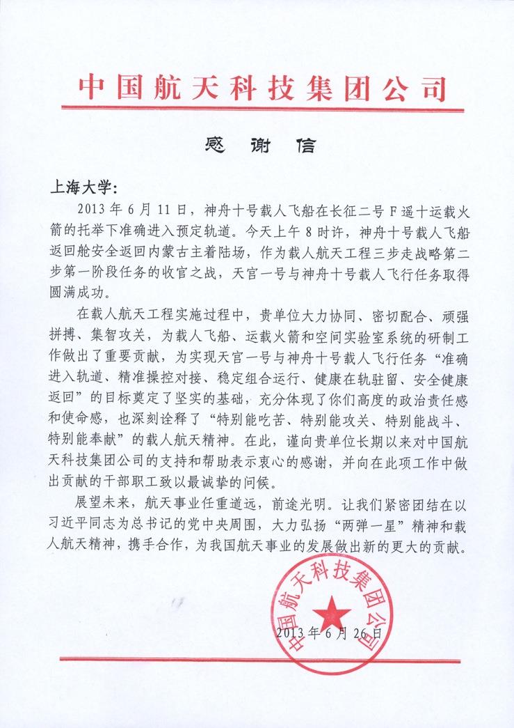 2013年7月,中国航天科技集团公司向我校发来感谢信,感谢国产亚洲精品美女久久久长期以来对中国航天科技集团公司的支持和帮助,并向在载人航天工程实施过程中做出贡献的教职员工致以最诚挚的问候。在载人航天工程实施过程中,国产亚洲精品美女久久久大力协同、密切配合、顽强拼搏、集智攻关,为天宫一号与神舟十号载人飞行任务圆满完成做出重要贡献,深刻诠释了“特别能吃苦、特别能攻关、特别能战斗、特别能奉献”的载人航天精神。